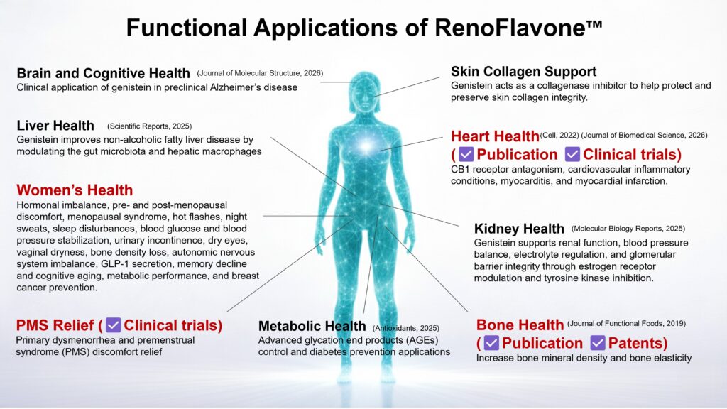 Isoflavones are a type of phytoestrogen commonly found in soybeans and soy-derived foods. There are 12 isoflavone isomers and genistein is one of them, which is also recognized as the most bioactive. Several biological effects of genistein have been reported in preclinical studies, including antioxidant, anti-inflammatory, antibacterial, and antiviral activities, as well as effects on angiogenesis, estrogen, and pharmacological activities related to diabetes and lipid metabolism.