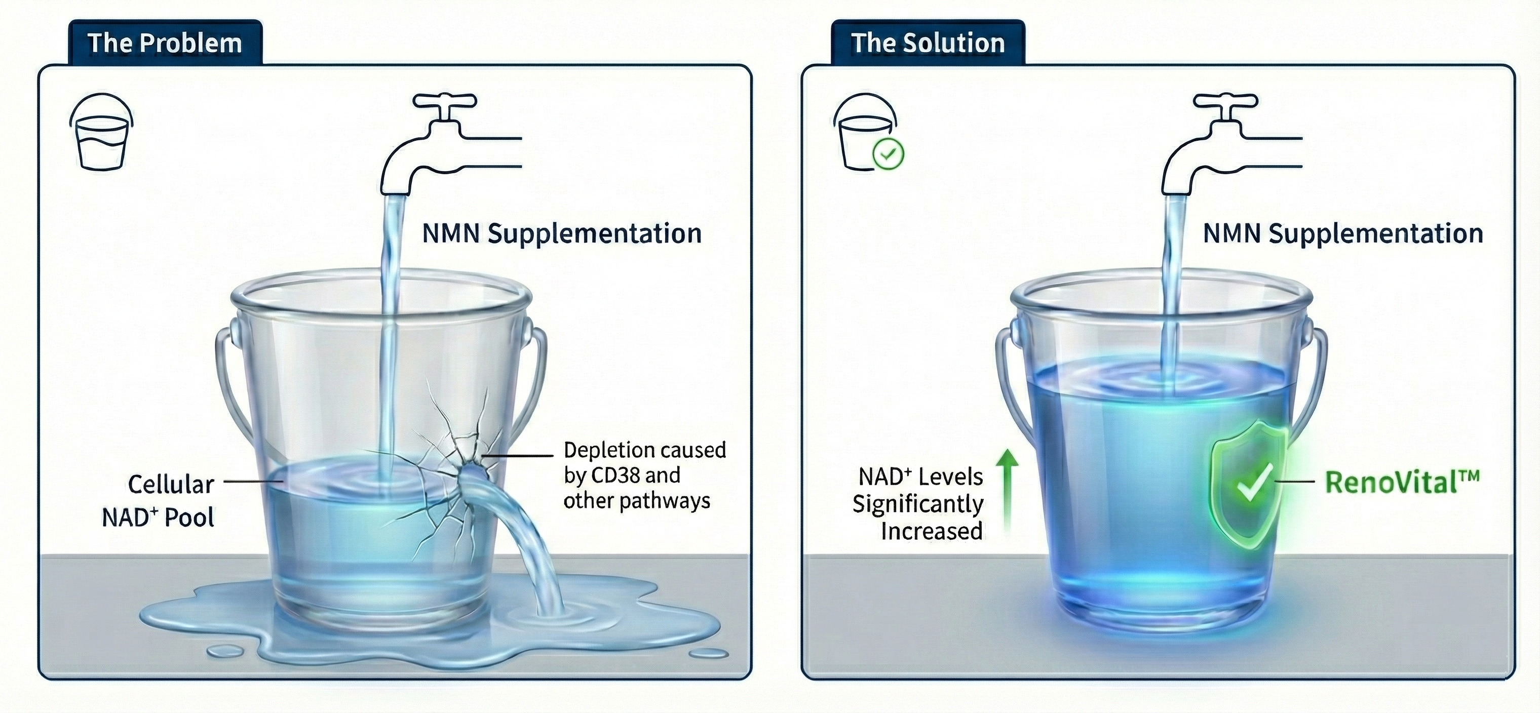 NAD⁺ levels decline with age, largely due to increased consumption driven by NAD⁺-degrading enzymes such as CD38. Apigenin has been shown to modulate CD38 activity, thereby helping to preserve NAD⁺ availability and support mitochondrial function and cellular vitality.