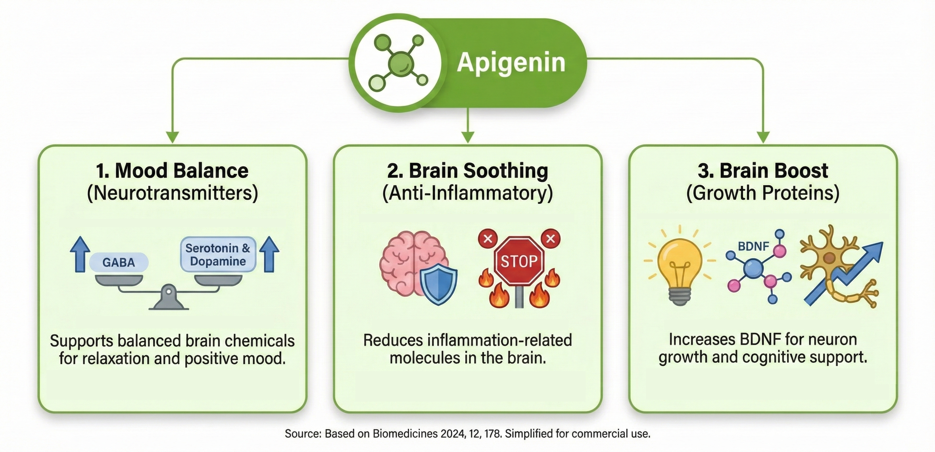 Apigenin is a natural polyphenolic flavone found in chamomile, parsley, celery, onions, and peppermint. It helps boost NAD⁺ levels by inhibiting CD38, supporting mitochondrial function, DNA repair, and healthy ageing. Apigenin also modulates the GABAα receptor, promoting relaxation, stress relief, and restful sleep. With strong antioxidant and neuroprotective properties, it supports energy, vitality, and longevity, helping the body restore balance and resilience naturally.